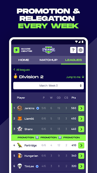 • Compete in 30-player capped leagues with promotion and relegation each week