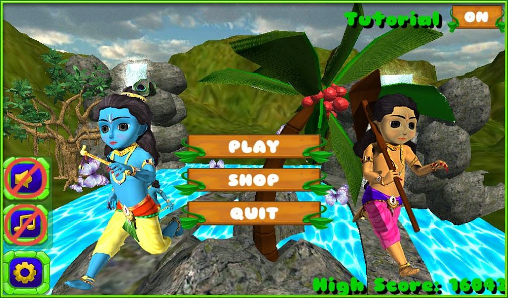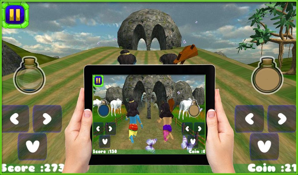 Little Brothers Krishna และ Balarama 3D Running เกมโดยเฉพาะอย่างยิ่งสำหรับเด็กและเกมฉากเกมที่สวยงามและสภาพแวดล้อมทางธรรมชาติที่มีน้ำตกน้ำ, ฝน, ผีเสื้อบินและ goshala "(วัวสถานที่) ฉากในเกมเล่นเกมวิ่งที่ไม่มีที่สิ้นสุด การเล่นเกม