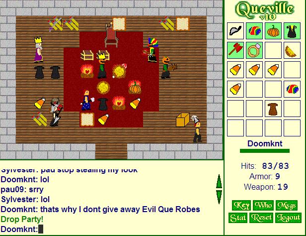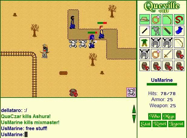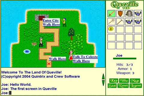 Queville เป็นเกมสวมบทบาทผู้เล่นหลายคนที่มีกราฟิก 2D พิกเซลแตะบนหน้าจอเพื่อย้ายอวตารของคุณไปรอบ ๆ คุณสามารถคลิกสิ่งต่าง ๆ เช่น "Enter City" และ "Attack Rat"