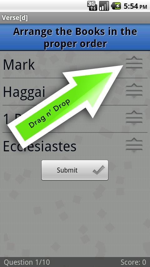 - user gets a random Bible verse with words taken out of it and put in a word bank. User then has to select the correct words to fill in the blanks and complete the verse.