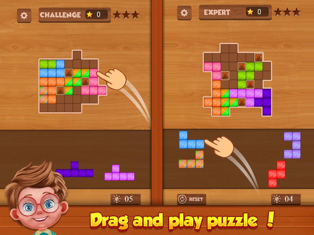 Simply Drag the blocks, and fill up all grids to complete the shape.Easy to play and get addicted while playing this wood puzzle game.