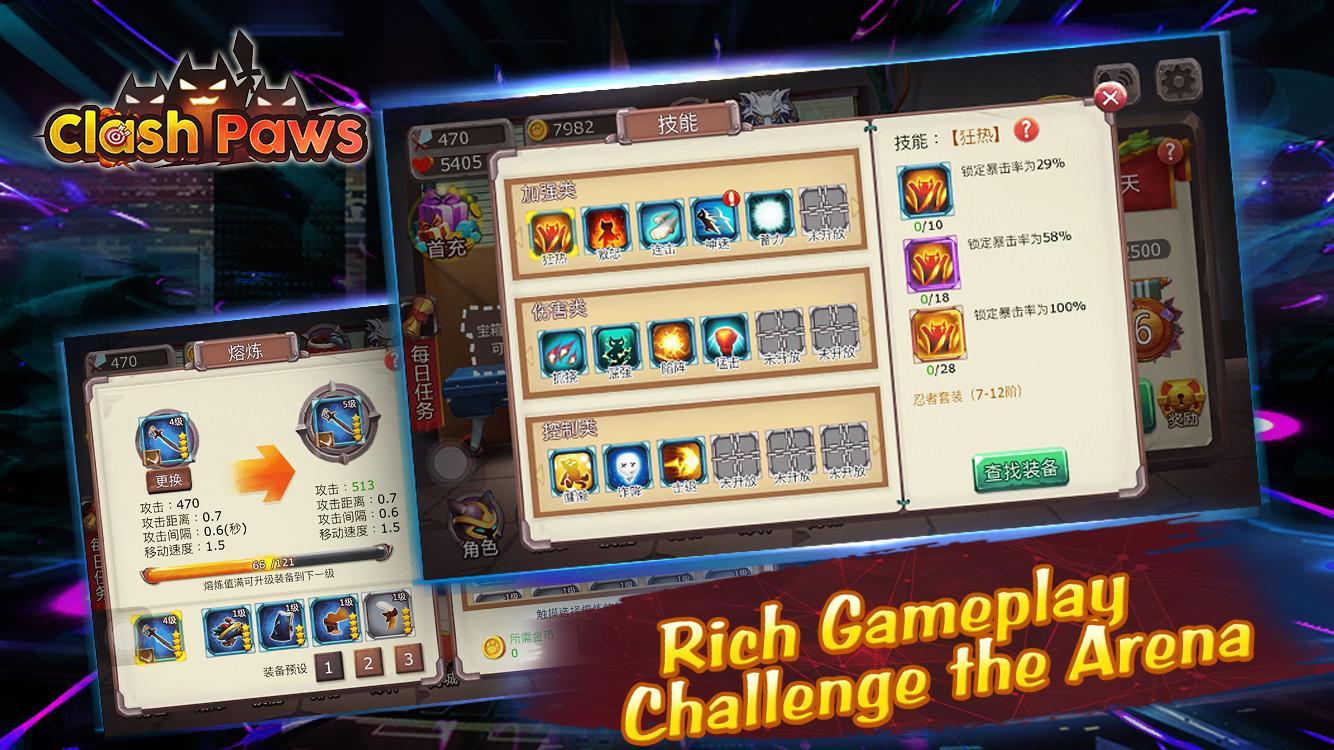 Clash Paws包括战斗模式,1V1挑战,1V1街机和老板挑战赛。每场战斗都在30秒内。它很短,因此您可以随时开始挑战。赢得奖励并使用它们来升级猫时,您将获得奖励(物品)。