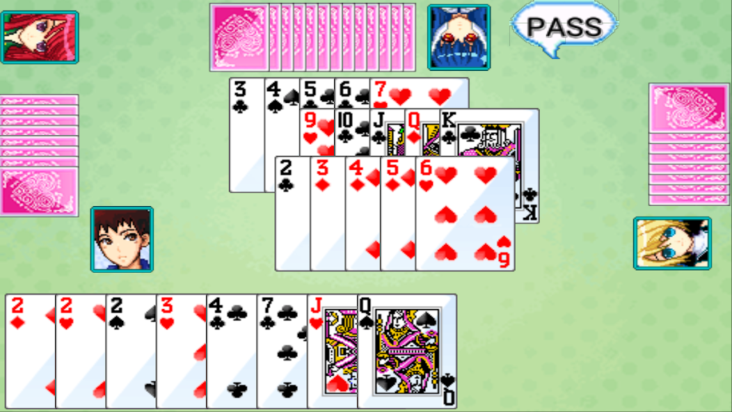 Cute Girlish Big 2遵循Big 2的经典规则。您可以像通常玩Big 2一样(对于4个玩家,每张获得13张卡片)。 3个俱乐部首先是带有一张卡,一组双打或5张牌的手。顺时针旋转,直到没有人能在整个回合中击败最高卡。优胜者首先摆脱了所有卡片。