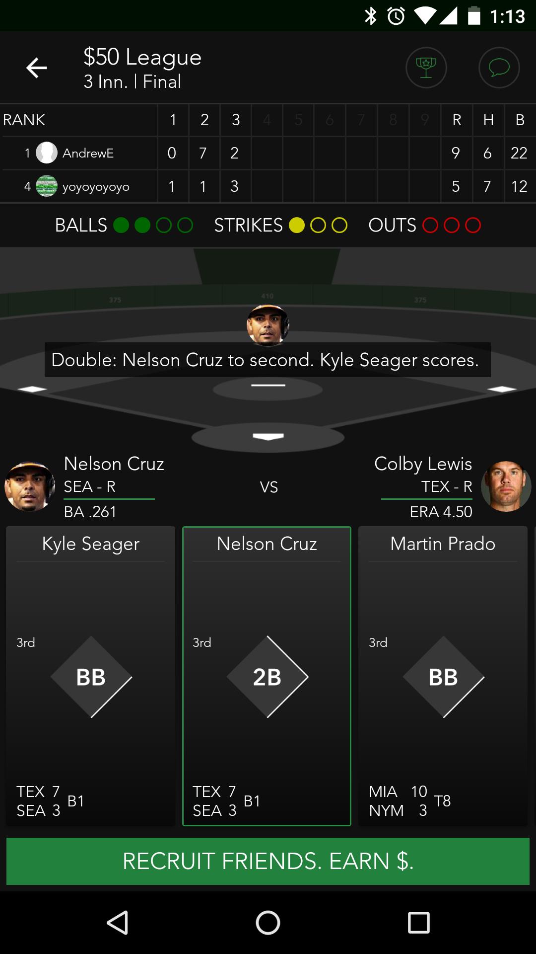 最好的部分是它像真正的棒球一样得分。如果您的球员在真正的游戏中获得单打,他还将在您的InGame Fantasy棒球比赛中达到第一垒。尝试在1到9局比赛中取得比对手更多的跑步。