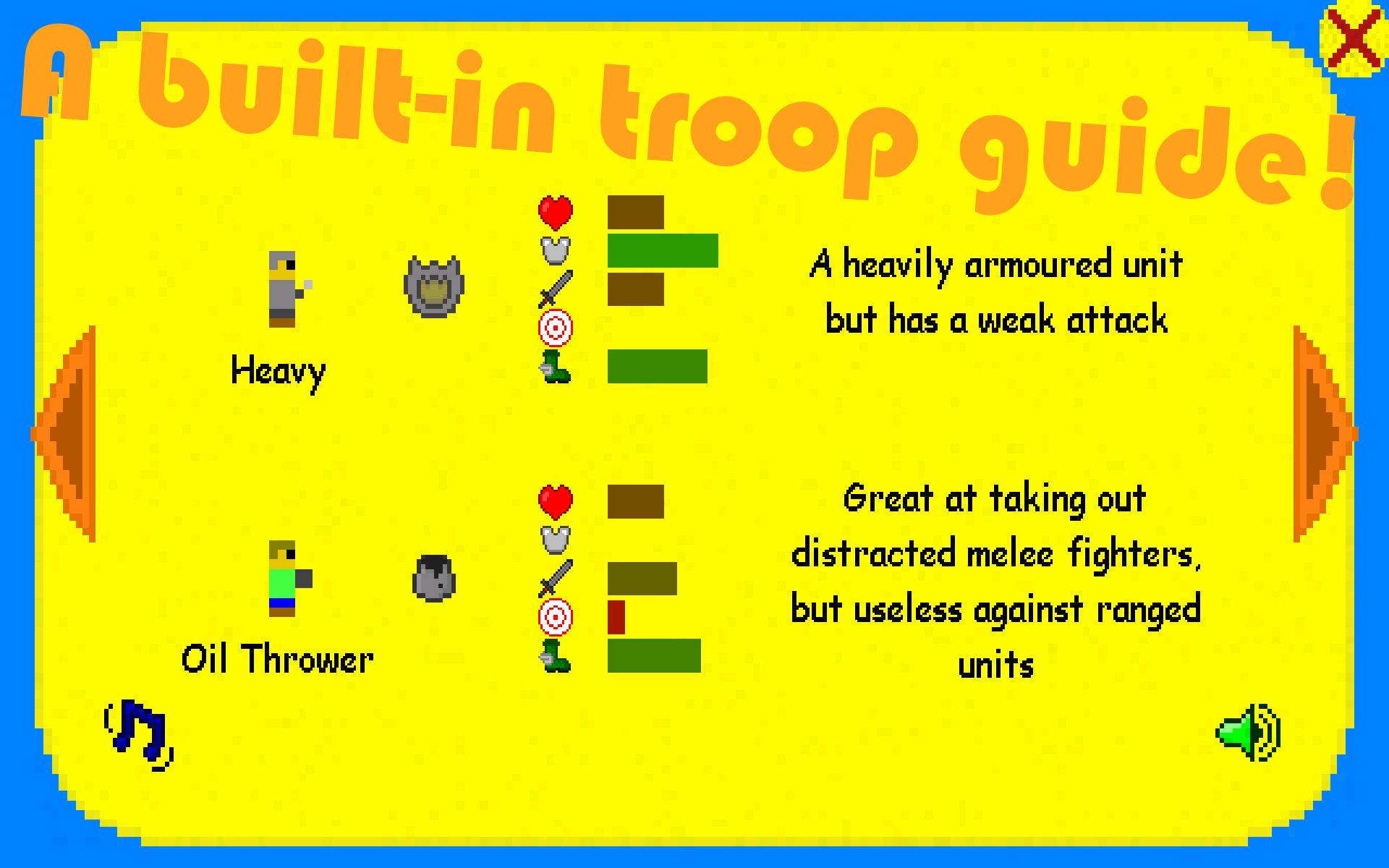 每天晚上,敌人的浪潮都会产生。您的工作是建立正确的军队来对抗敌人的军队。您可以在暂停菜单上的“说明”按钮中阅读有关部队的信息。您甚至可以在沙箱上练习,以帮助您通过遇到的不同部队变得更好。