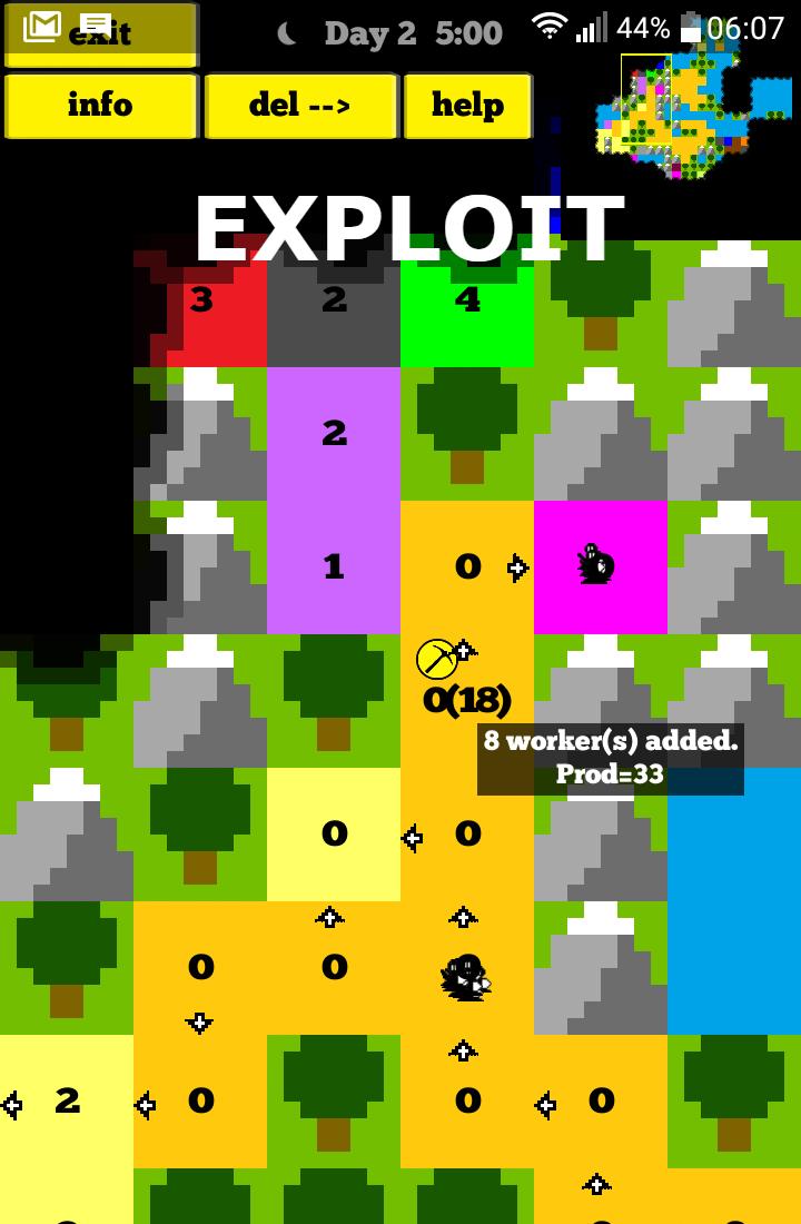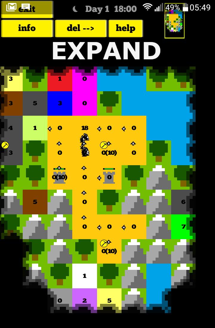 您从一个带有50名士兵的黄色正方形开始。该地图几乎完全被战争的雾遮住了。首先扩大您的领土,提高您的看法。建造城堡,训练更多的士兵并进一步扩大。