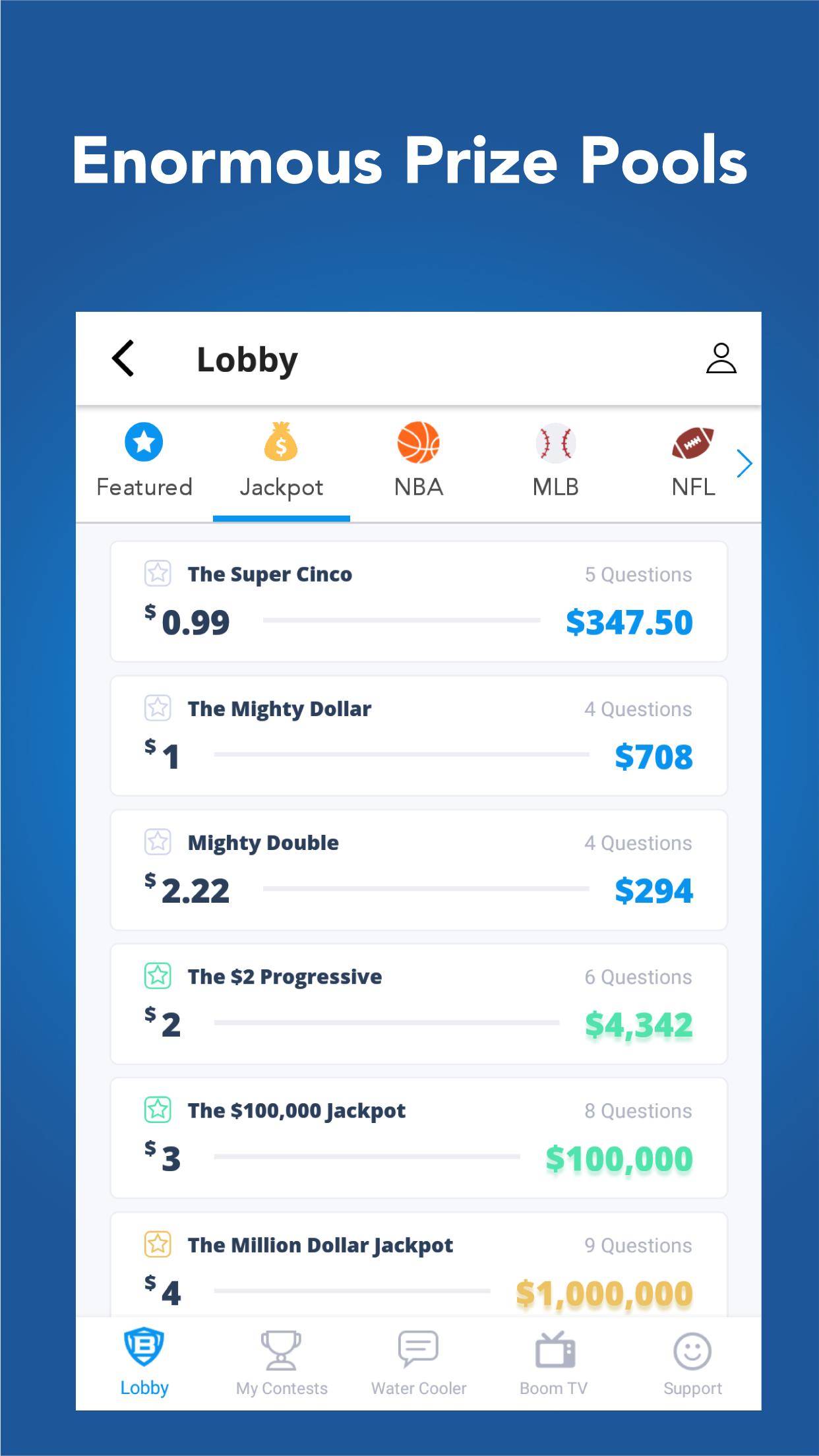 Boom Fantasy是世界上排名第一的Pick'Em和Jackpot Fantasy Sports Ginate。雖然其他日常幻想運動網站迎合鯊魚, Boom Fantasy為真正的體育迷提供了贏得巨大現金獎品的機會。